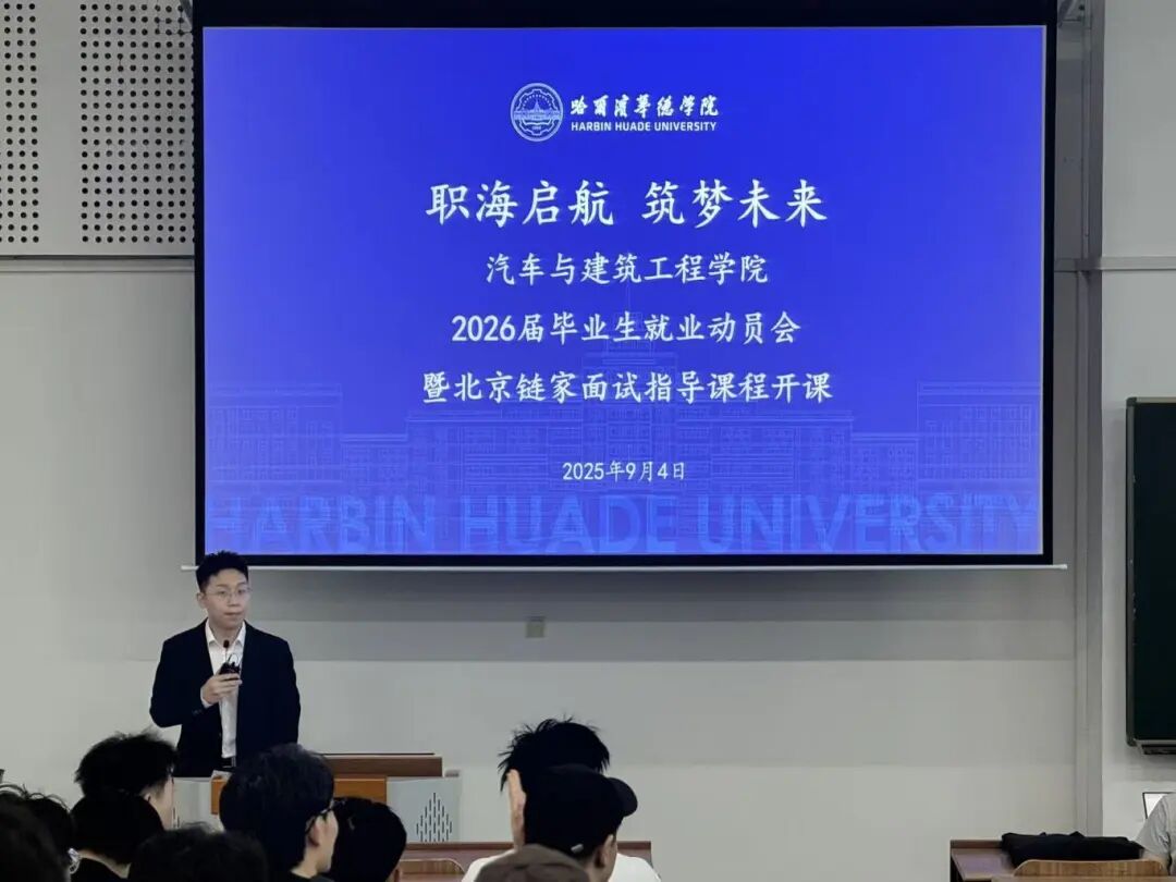 为进一步引导2026届毕业生明确职业规划、提升就业能力,9月4日,汽车与建筑工程学院举办2026届毕业生就业动员会暨北京链家面试指导课程开课活动。本次活动特邀北京链家房地产经纪有限公司校园招聘经理刘嗣清担任嘉宾,就业指导服务中心赵丹丹老师、汽车与建筑工程学院副院长(主持工作)宁士君、学生发展中心主任李琳琳、各系主任、2026届全体毕业班辅导员及2026届毕业生参会。