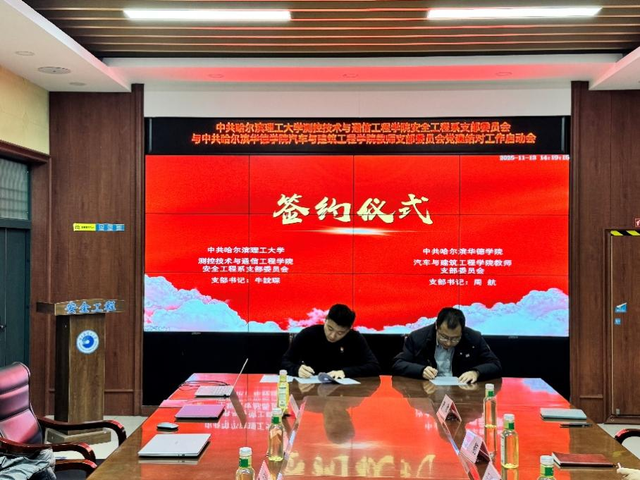 签约仪式上,哈尔滨理工大学安全工程系教师党支部书记牛訦琛对哈尔滨华德学院汽车与建筑工程学院一行的到来表示热烈欢迎,并充分肯定共建合作的战略意义。他详细介绍了测控技术与通信工程学院在党的建设、学科建设、科学研究和人才培养等方面取得的成就与特色。他指出,两院系虽各有侧重,但在工程教育、实践育人、服务产业等方面目标一致、优势互补性强。此次共建为双方提供了一个宝贵的交流平台,希望双方能以党建为引领,以共建为契机,围绕“组织建设互促、党员师生互动、党建资源互享、中心工作联动”等方面开展深度合作,定期交流党建工作经验,共享优质培训资源,联合开展主题实践活动,共同攻关教学科研难题,努力形成“抓党建、带队伍、促发展”的整体合力,打造校际基层党建合作的典范,实现“1+1>2”的共建效果。